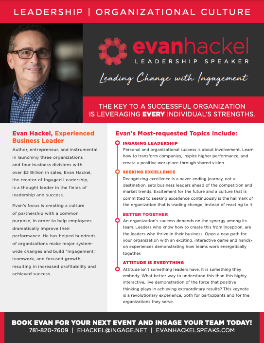Evan Hackel is a sought-after keynote speaker and consultant specializing in orchestrating organizational transformation through inspirational leadership, collaboration and embracing change.